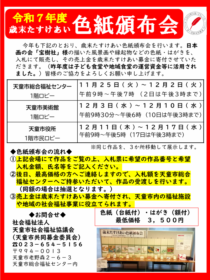 毎年恒例となりました「歳末たすけあい色紙頒布会」を、下記の日程で行います。(同じ作品を3か所移動して展示します。)