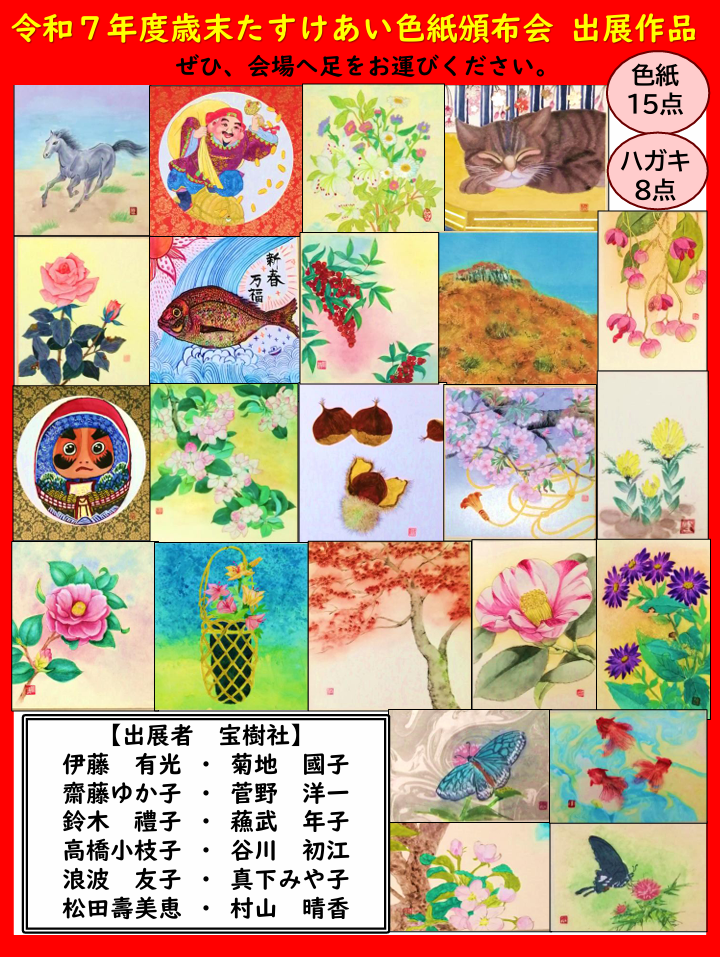 日本画の会宝樹社様が描いた来年の干支、大黒様などの縁起物、風景画や花の色紙やはがきなど、お正月等に飾るのにぴったりな素敵な作品が勢ぞろいです。